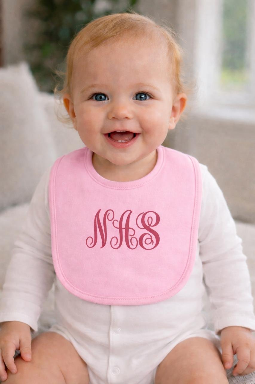 Shop personalized baby bibs with custom name embroidery, designed for softness, absorbency, and everyday feeding comfort.